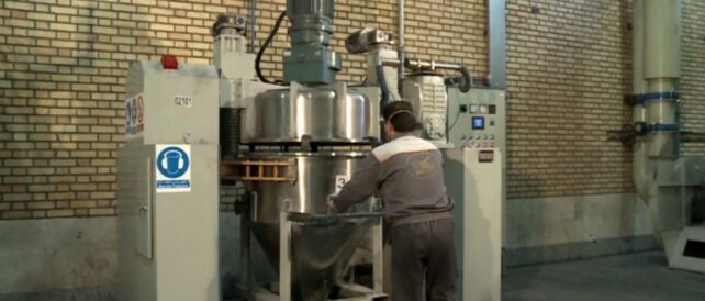 Смешение компонентов. В зависимости от размера загруженного смесью передвижного контейнера операция выполняется промышленных смесителях (миксерах). Режим смешивания задается на таймере пульта управления. Для исключения перегрева на смесительную головку миксера подается охлажденная вода. По окончании смешения компонентов готовая смесь (шихта) в контейнере перевозится на участок экструзии.